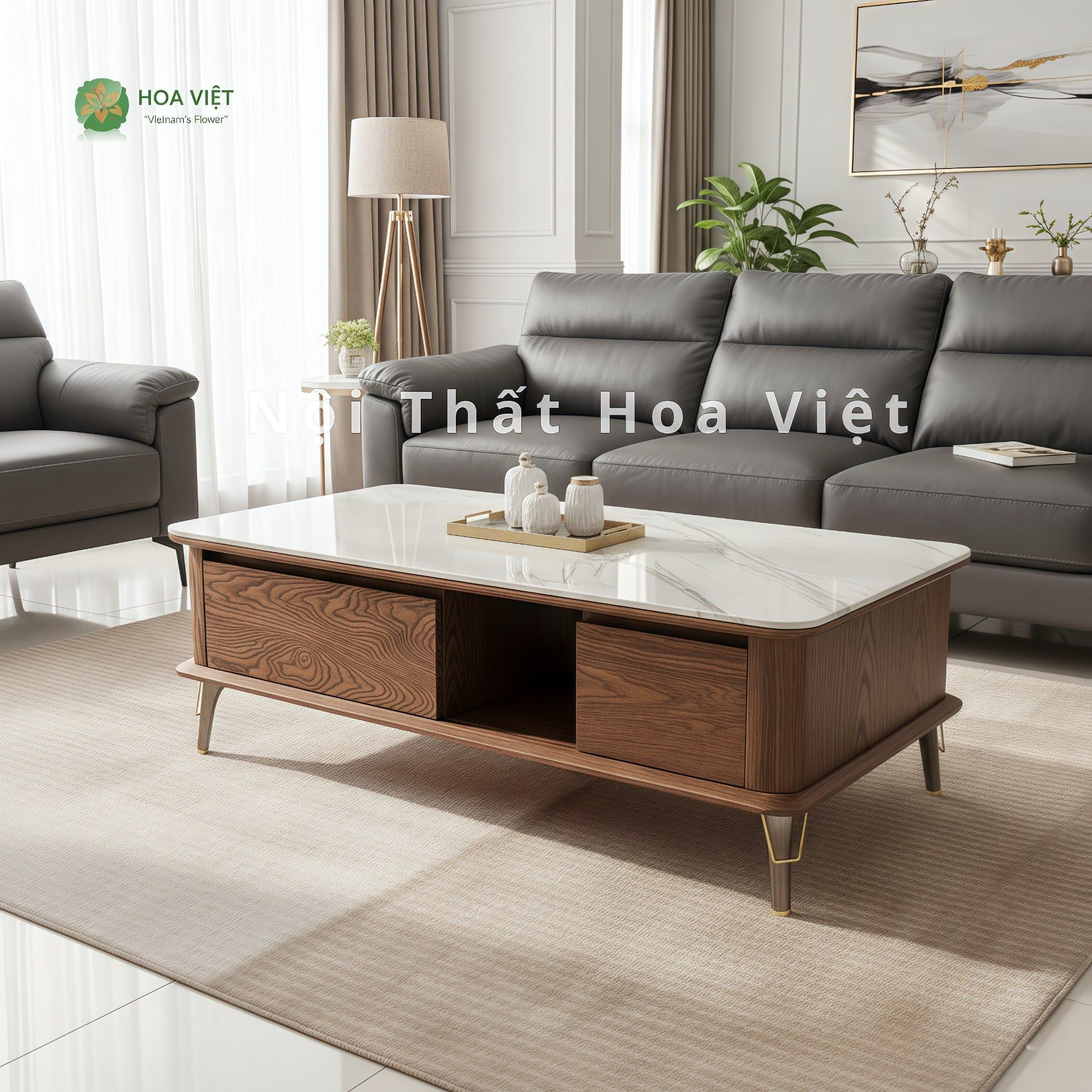 Bàn trà Hoa Việt là lựa chọn hoàn hảo cho phòng khách hiện đại. Thiết kế tinh tế, kiểu dáng vuông vắn, phù hợp với nhiều không gian như chung cư, nhà phố hay biệt thự.