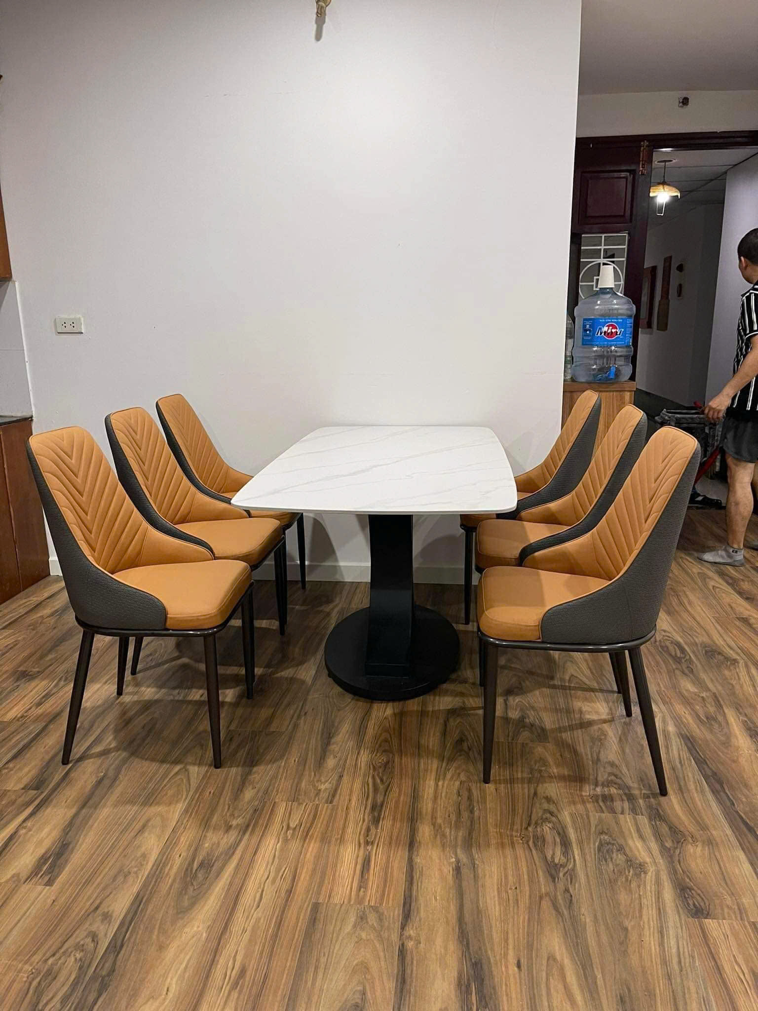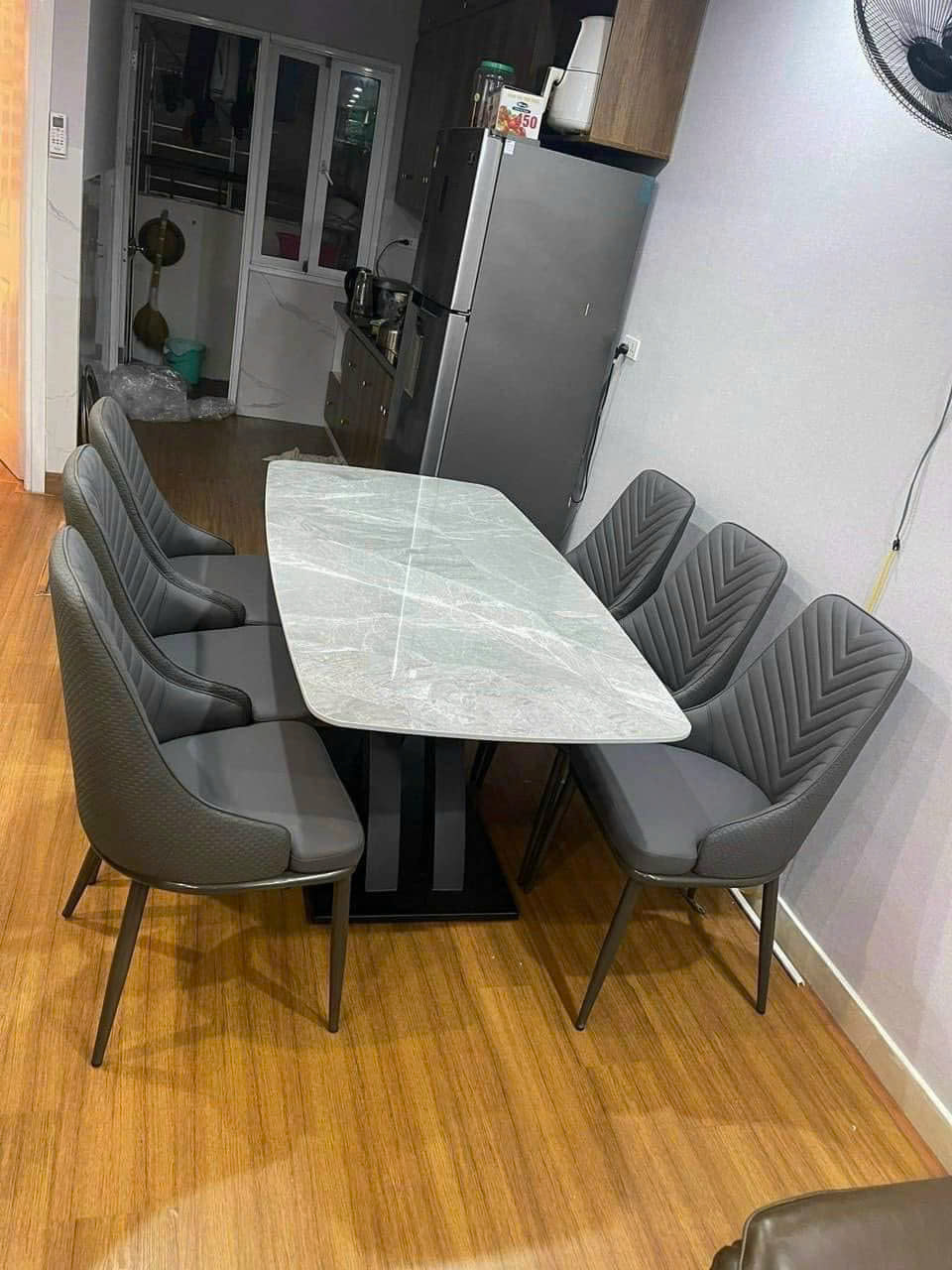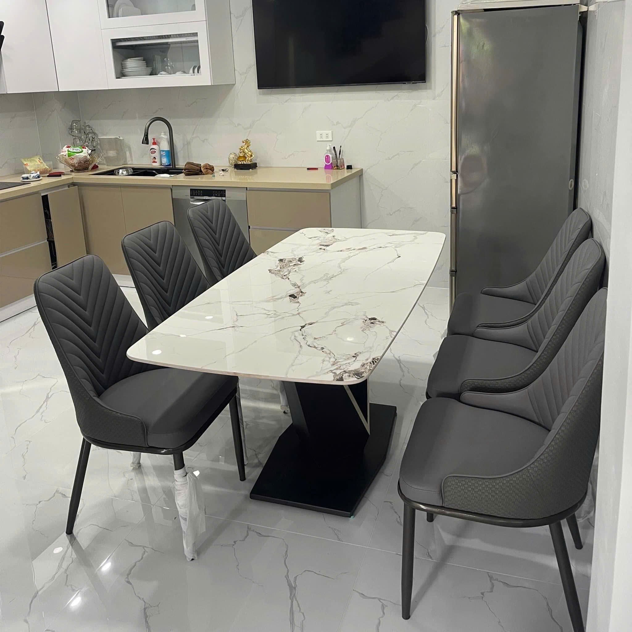 - Bộ bàn ăn mặt đá phiến hiện đại tạo cho không gian phòng ăn gia đình thêm thanh lịch, sang trọng.