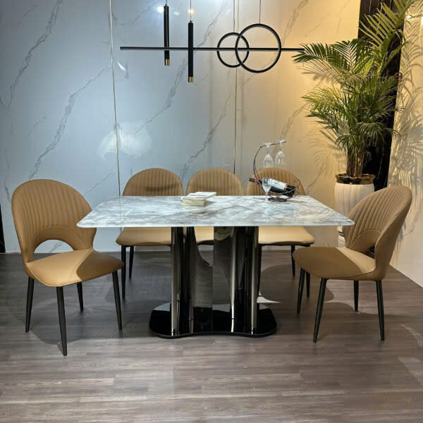 ✔ Chân bàn: Làm từ inox mạ cao cấp, tỉ mỉ đến từng chi tiết, mang lại vẻ ngoài thanh lịch và độ bền vượt trội.