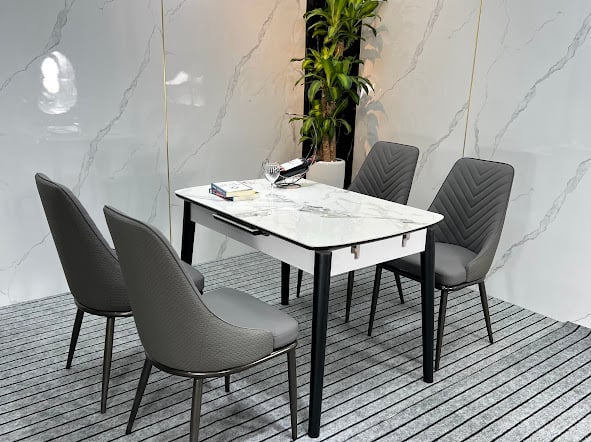Bộ bàn ăn mặt đá Ceramic chân sắt sơn đen tĩnh điện