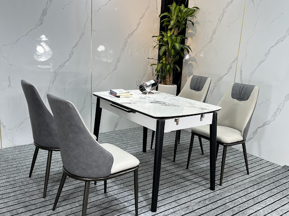 Bộ bàn ăn mặt đá Ceramic chân sắt sơn đen tĩnh điện