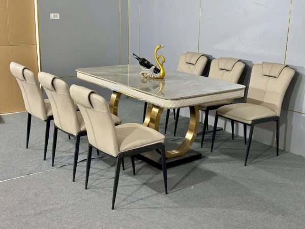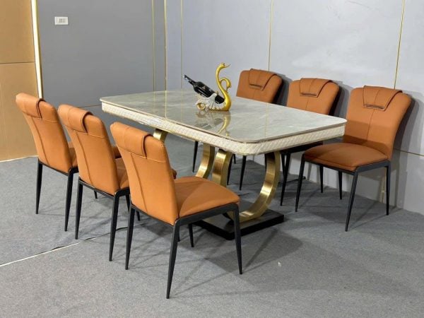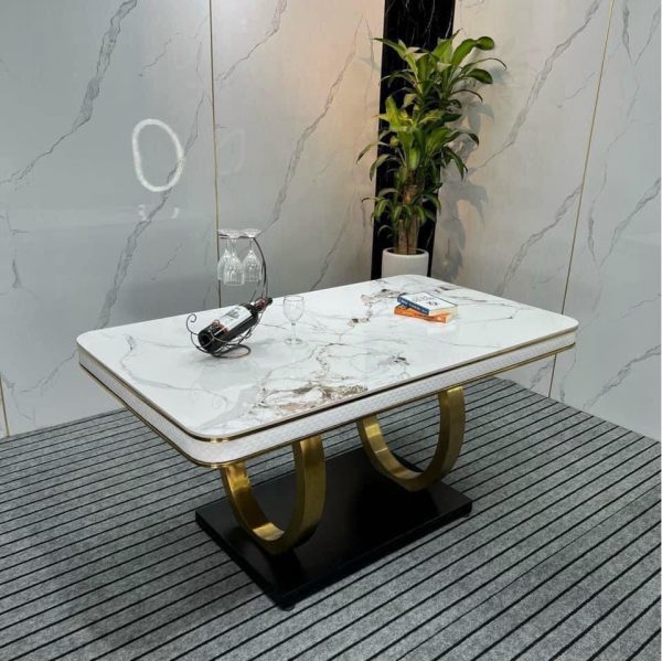 - Chất liệu bàn: Khung Inox mạ vàng Titan. Mặt bàn đá ceramic chống ố, chống thấm