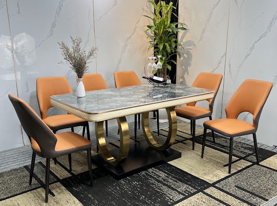 Bộ bàn ăn mặt đá Ceramic chân sắt sơn đen tĩnh điện