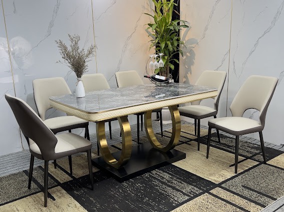 - Chất liệu bàn: Khung Inox mạ vàng Titan. Mặt bàn đá ceramic chống ố, chống thấm