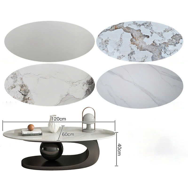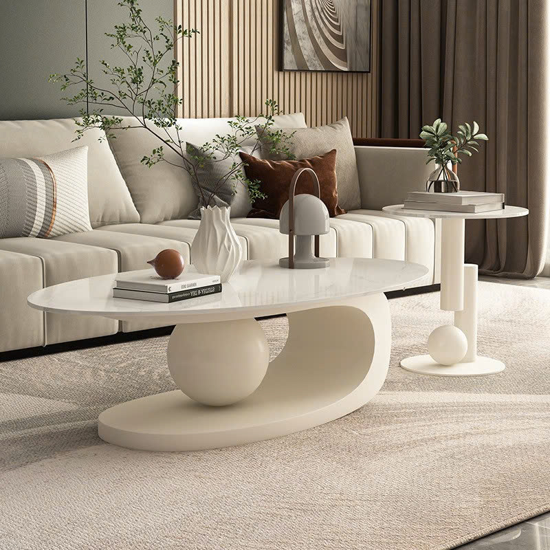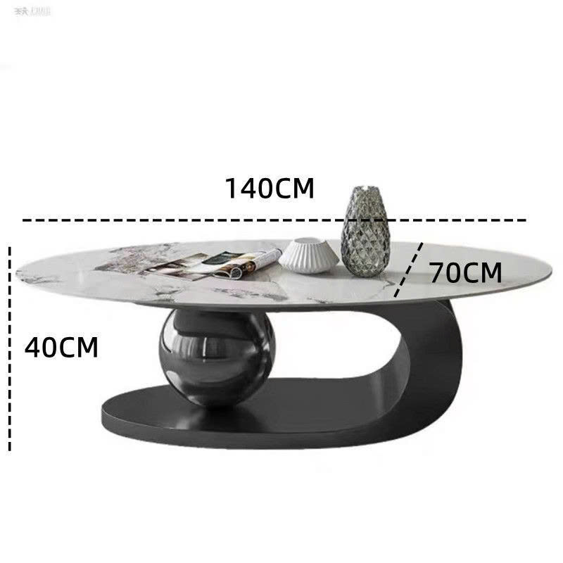 Bàn trà sở hữu mặt bàn hình oval thanh lịch, nổi bật với phần chân bàn uốn lượn mềm mại, kết hợp cùng chi tiết quả cầu tinh tế nằm gọn bên dưới. Đây không chỉ là một sản phẩm nội thất mà còn là tác phẩm nghệ thuật, thu hút ánh nhìn ngay từ lần đầu tiên.