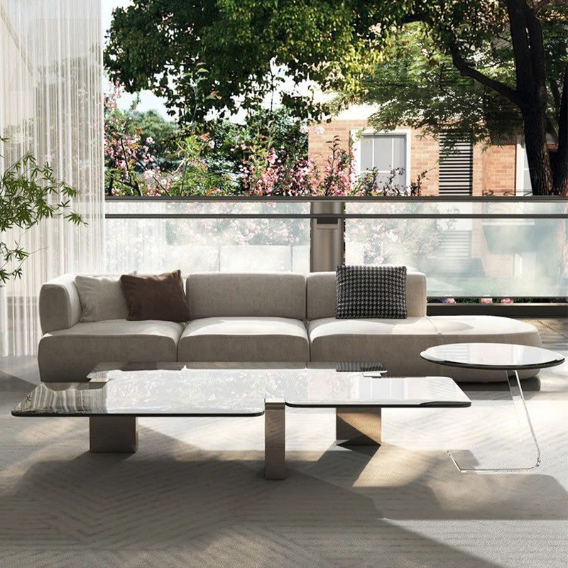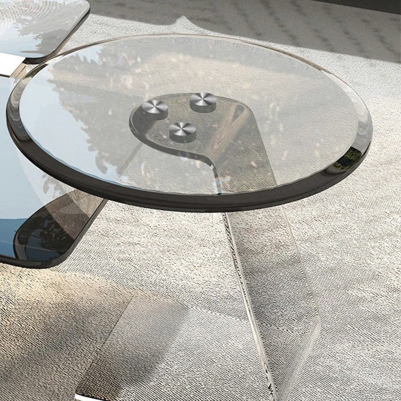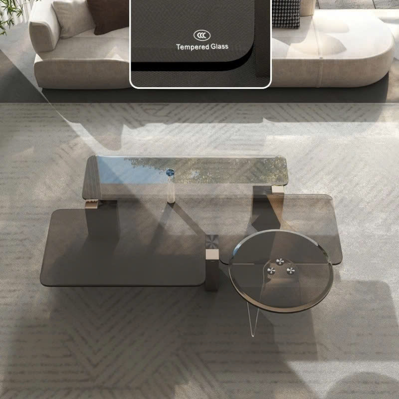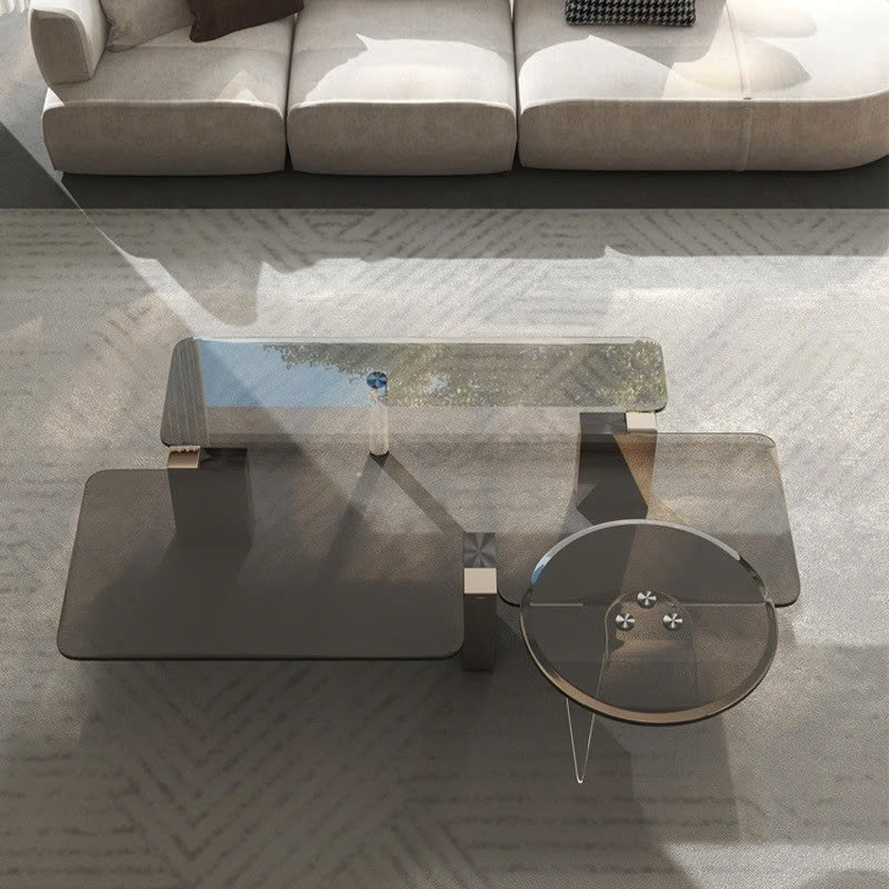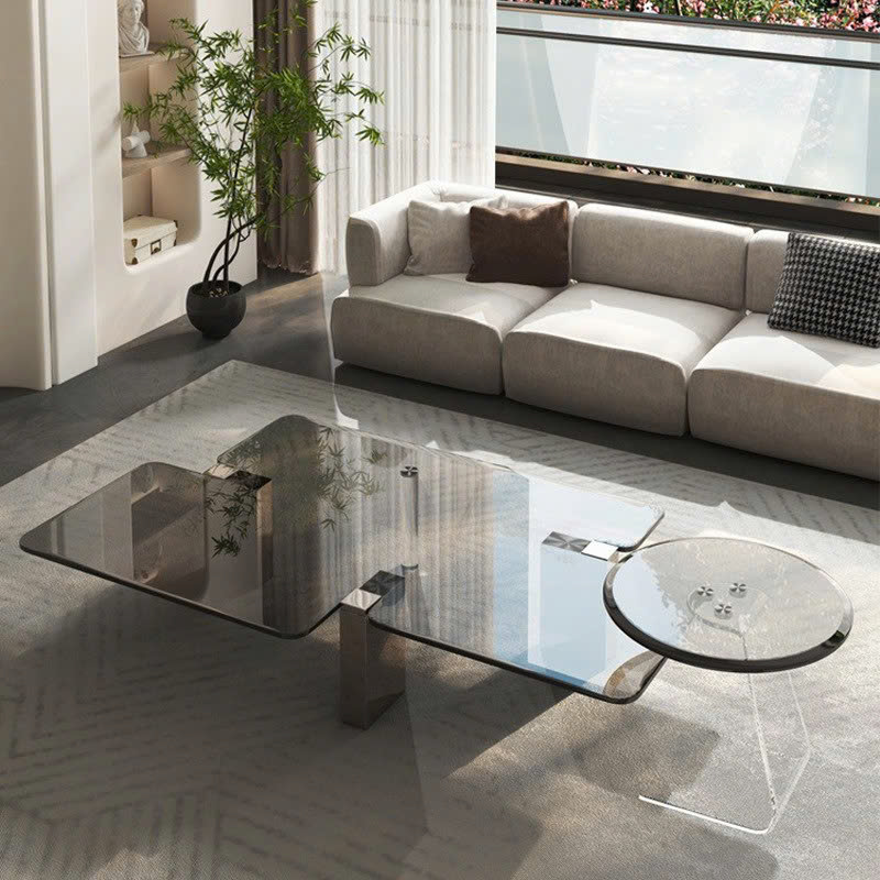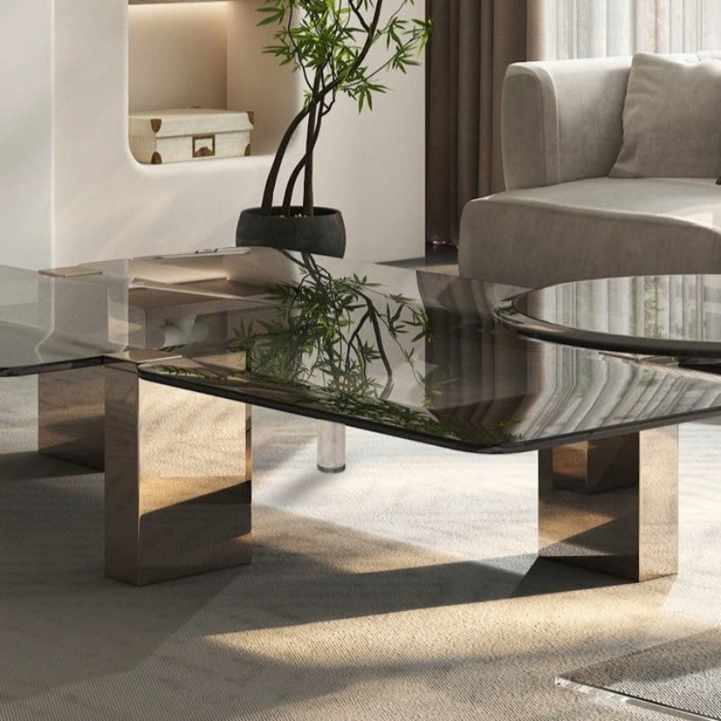 Bàn trà sở hữu mặt kính đa tầng với các mảng vuông, tròn được sắp xếp lệch nhau đầy sáng tạo, tạo nên hiệu ứng thị giác lạ mắt. Sự kết hợp giữa hình học vuông vắn và mềm mại mang lại sự cân bằng hoàn hảo giữa hiện đại và nghệ thuật.