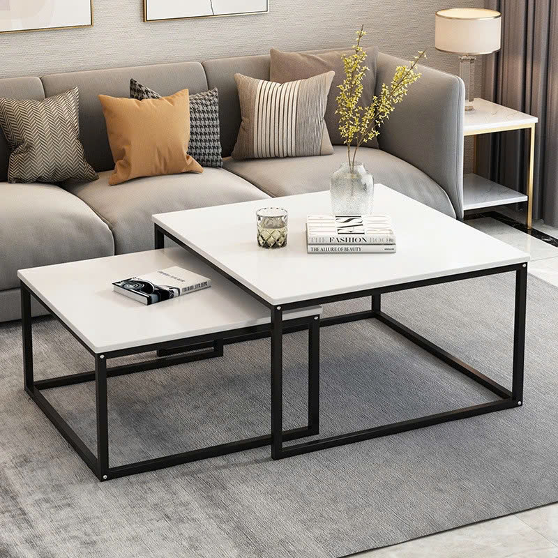Bộ bàn gồm hai bàn vuông có thể lồng ghép, tạo nên sự linh hoạt và tiết kiệm diện tích. Khung bàn kim loại chắc chắn, phủ sơn tĩnh điện bền đẹp, mang đến cảm giác thanh thoát nhưng không kém phần vững chãi.