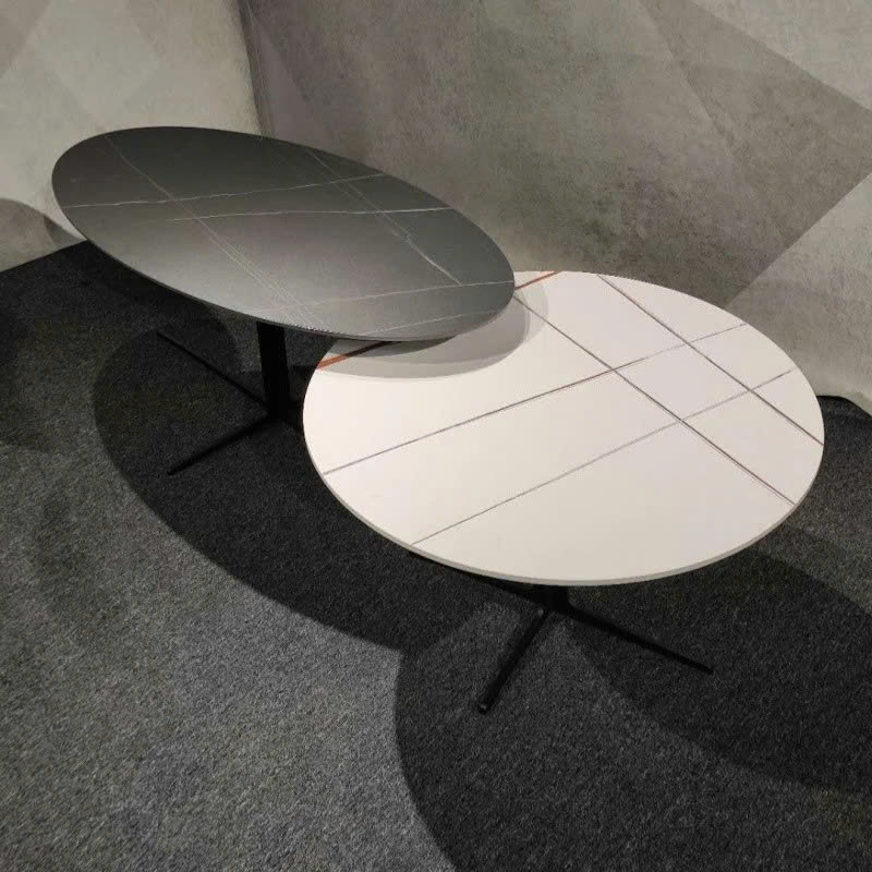 Bộ bàn gồm một bàn oval và một bàn tròn, tạo thành bộ đôi hoàn hảo vừa hài hòa vừa phá cách. Đặc biệt, màu đen nhám mạnh mẽ với những đường vân đá tinh xảo, giúp sản phẩm nổi bật giữa không gian và toát lên vẻ đẹp sang trọng, đầy cuốn hút.