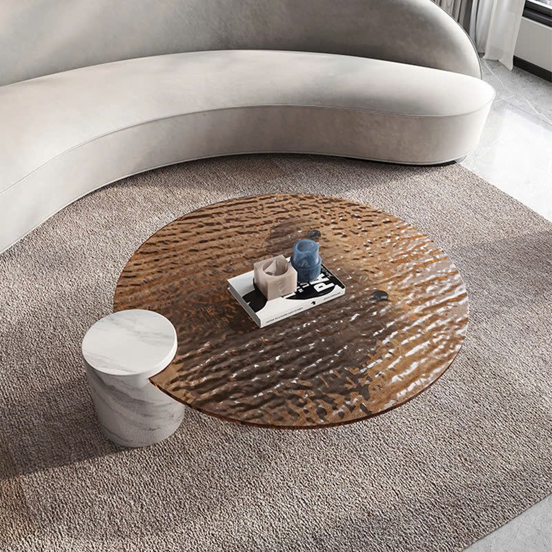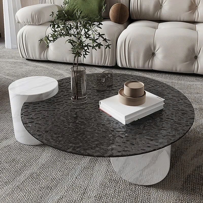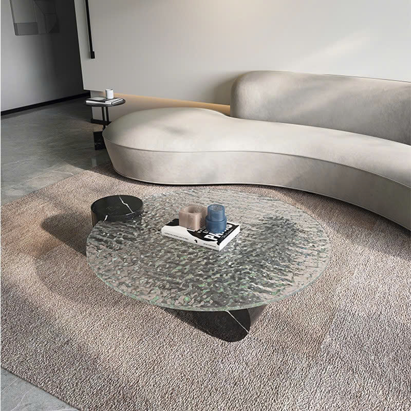 Mặt bàn hình tròn, làm từ kính dày với bề mặt được xử lý vân lượn sóng tự nhiên, tạo hiệu ứng ánh sáng rất sinh động.