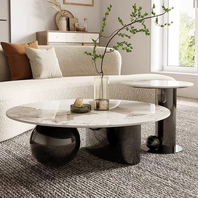 • Bàn lớn có mặt bàn tròn, dày dặn, với kết cấu chân độc đáo: một bên là quả cầu lớn, bên còn lại là trụ hình trụ vững chắc.