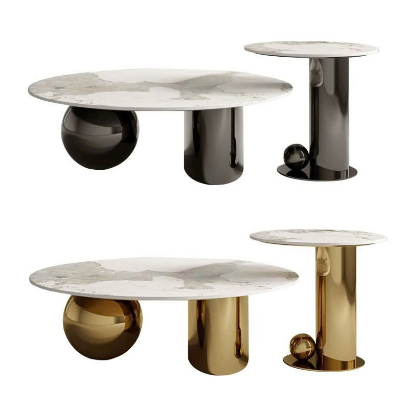 • Bàn nhỏ cũng có mặt bàn tròn, chân bàn gồm một trụ hình trụ kết hợp thêm một quả cầu nhỏ tạo điểm nhấn cân đối và lạ mắt.