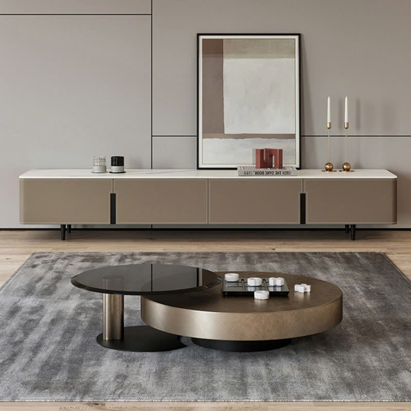Thân bàn phủ lớp kim loại ánh vàng sang trọng, bề mặt vân xước mờ tạo điểm nhấn tinh tế.